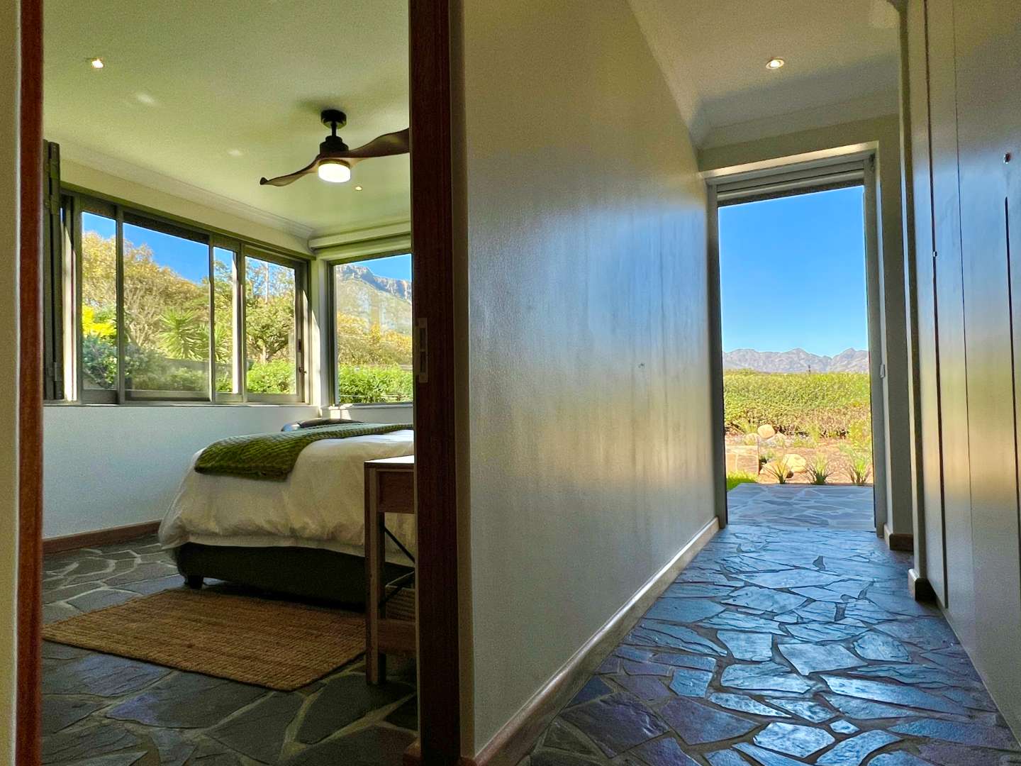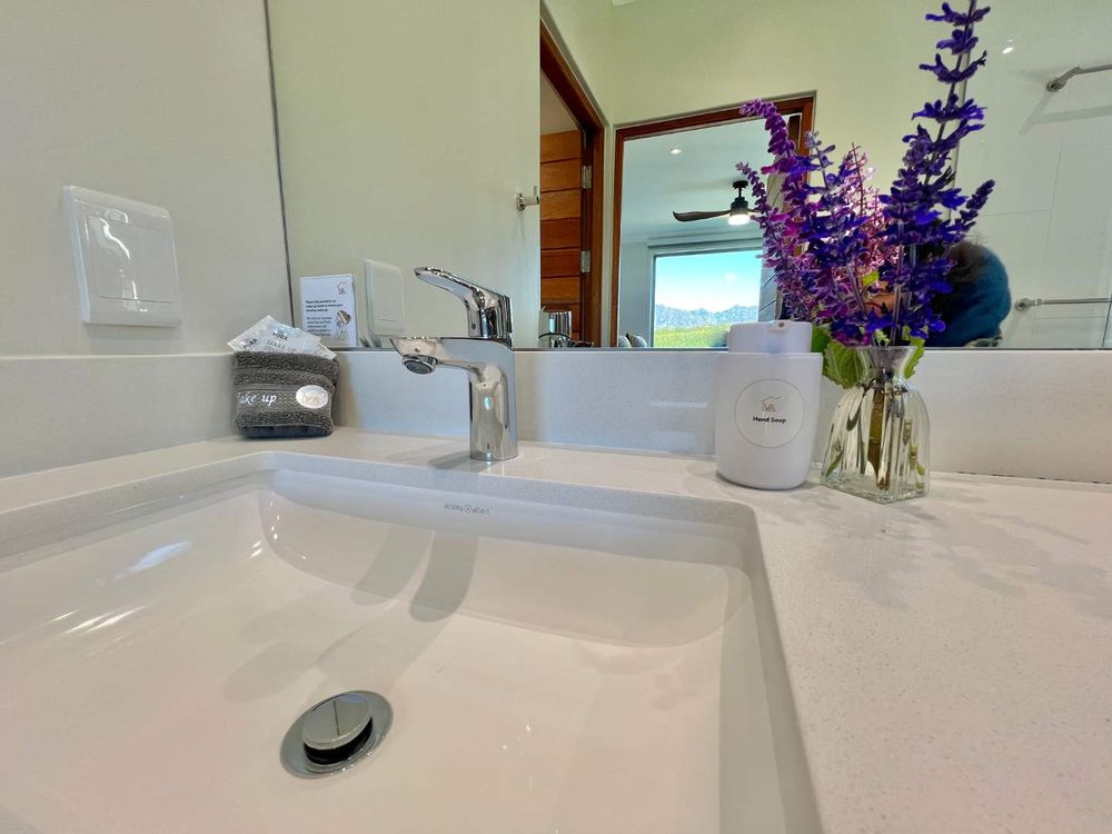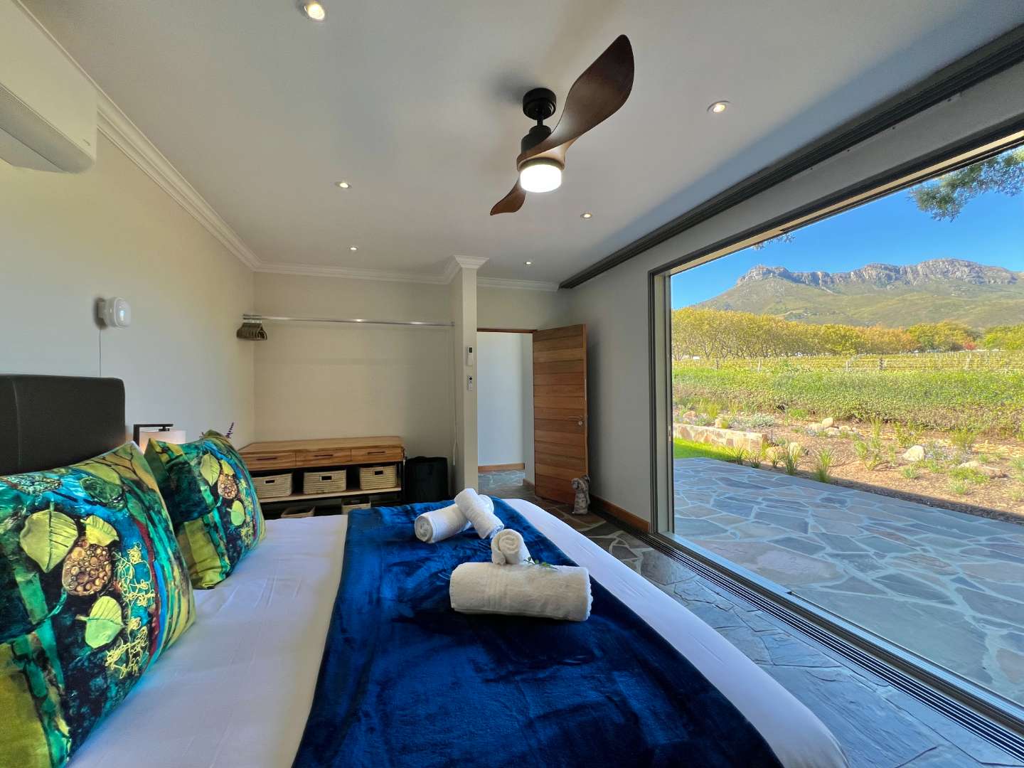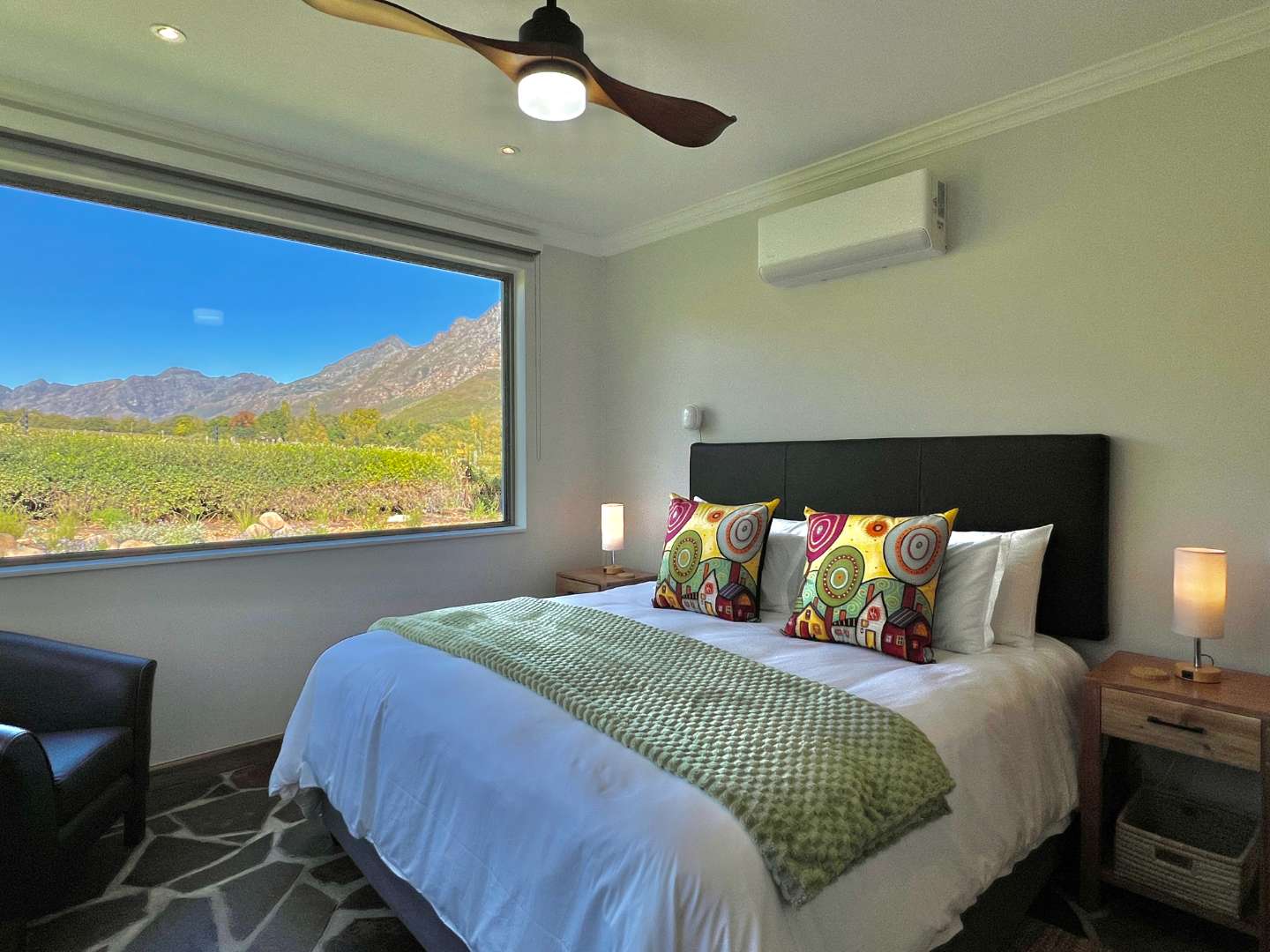 The home boasts 4 luxurious bedrooms, two with almost uninterrupted vineyard and mountain views to wake up to. You would not want to leave your room after watching the sun coming up in this magnificent setting...