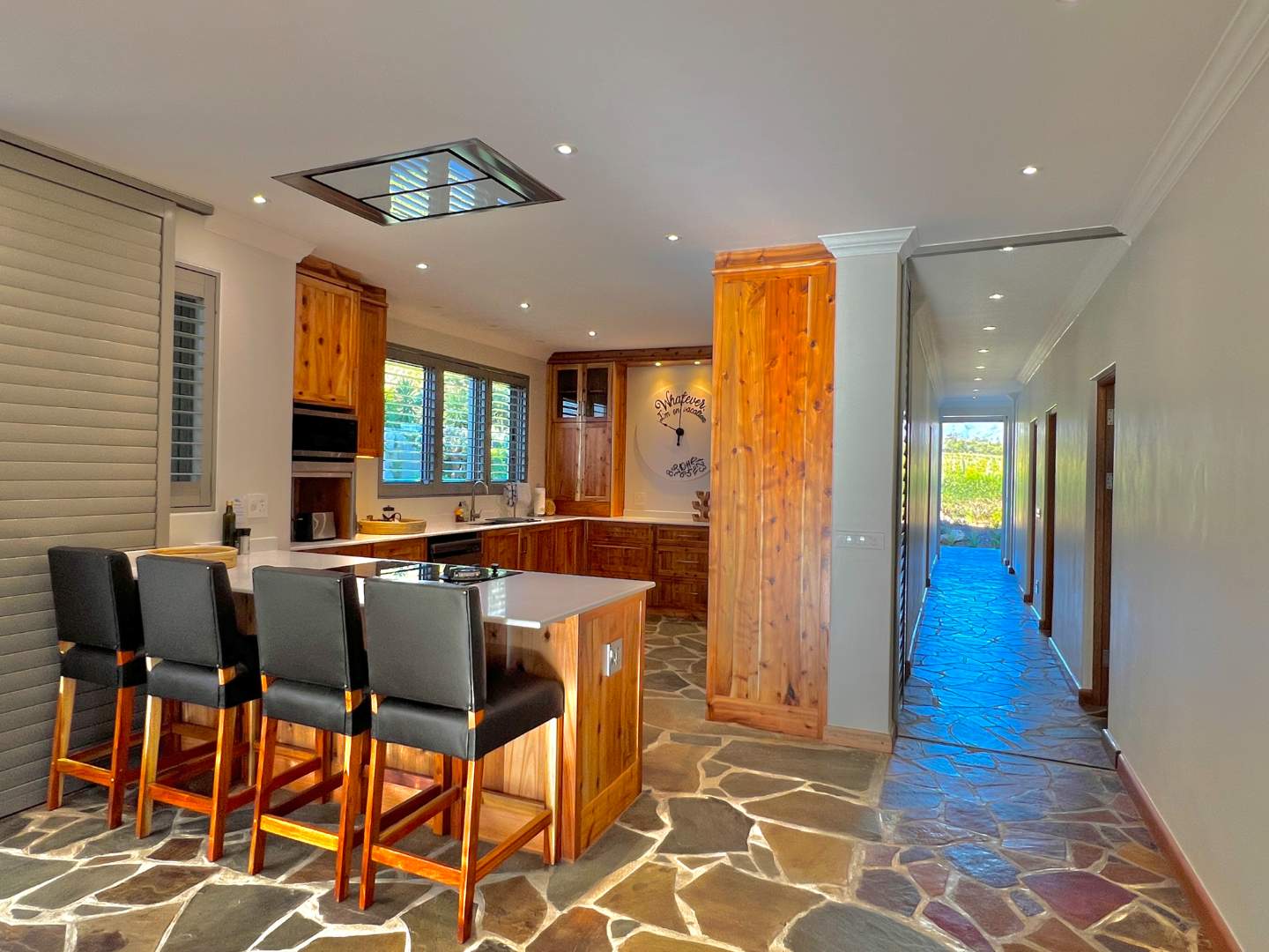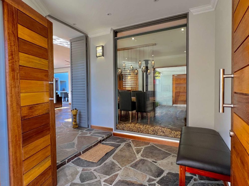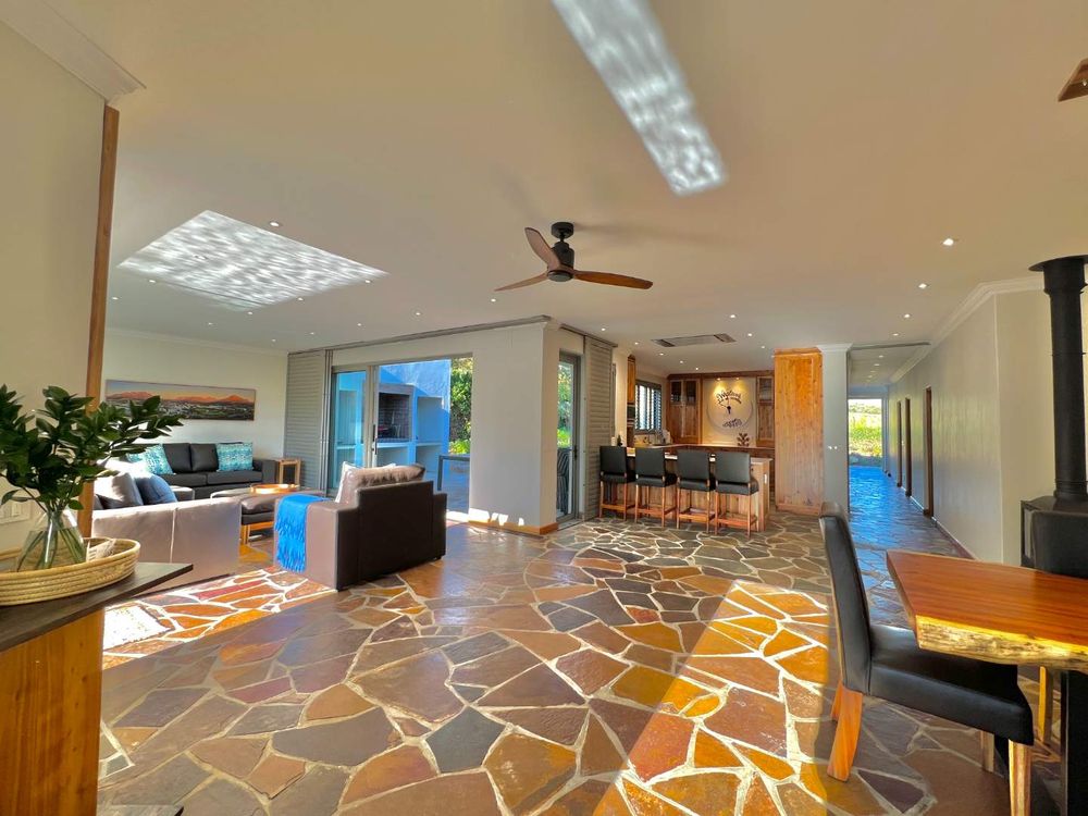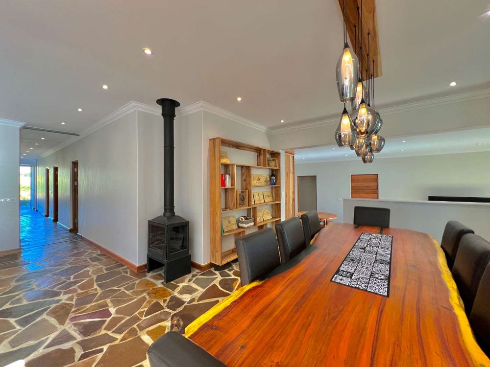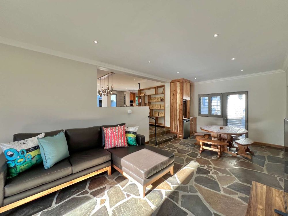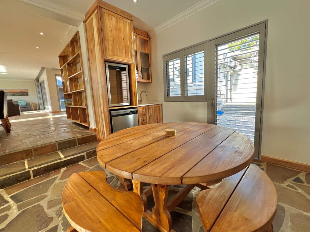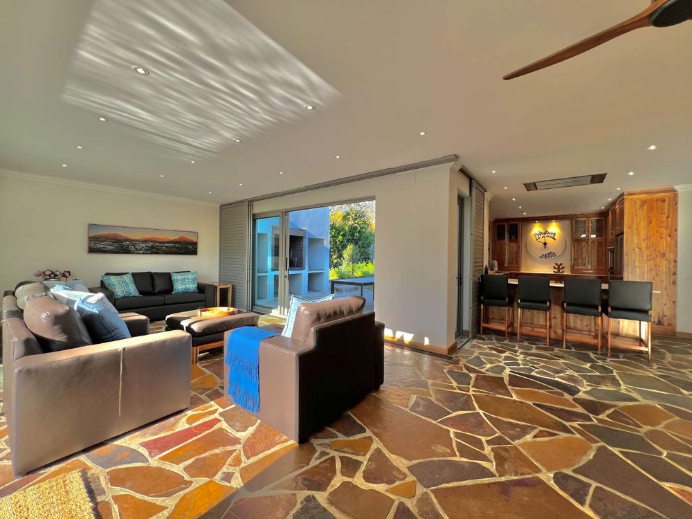Enter into spacious living areas that flow into one another, from the rim flow pool to the lounge and dining area, to the barbecue area, where you can start drinking in the magnificent views of the Lanzerac vineyards, Botmaskop and Die Pieke mountains. The kitchen forms part of the living area and has large windows, also opening onto the barbecue area. A sunken bar area with table, ideal for board games and a television and smaller lounge, rounds off the entertainment picture.