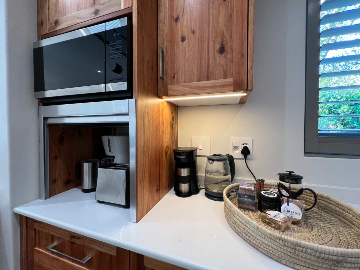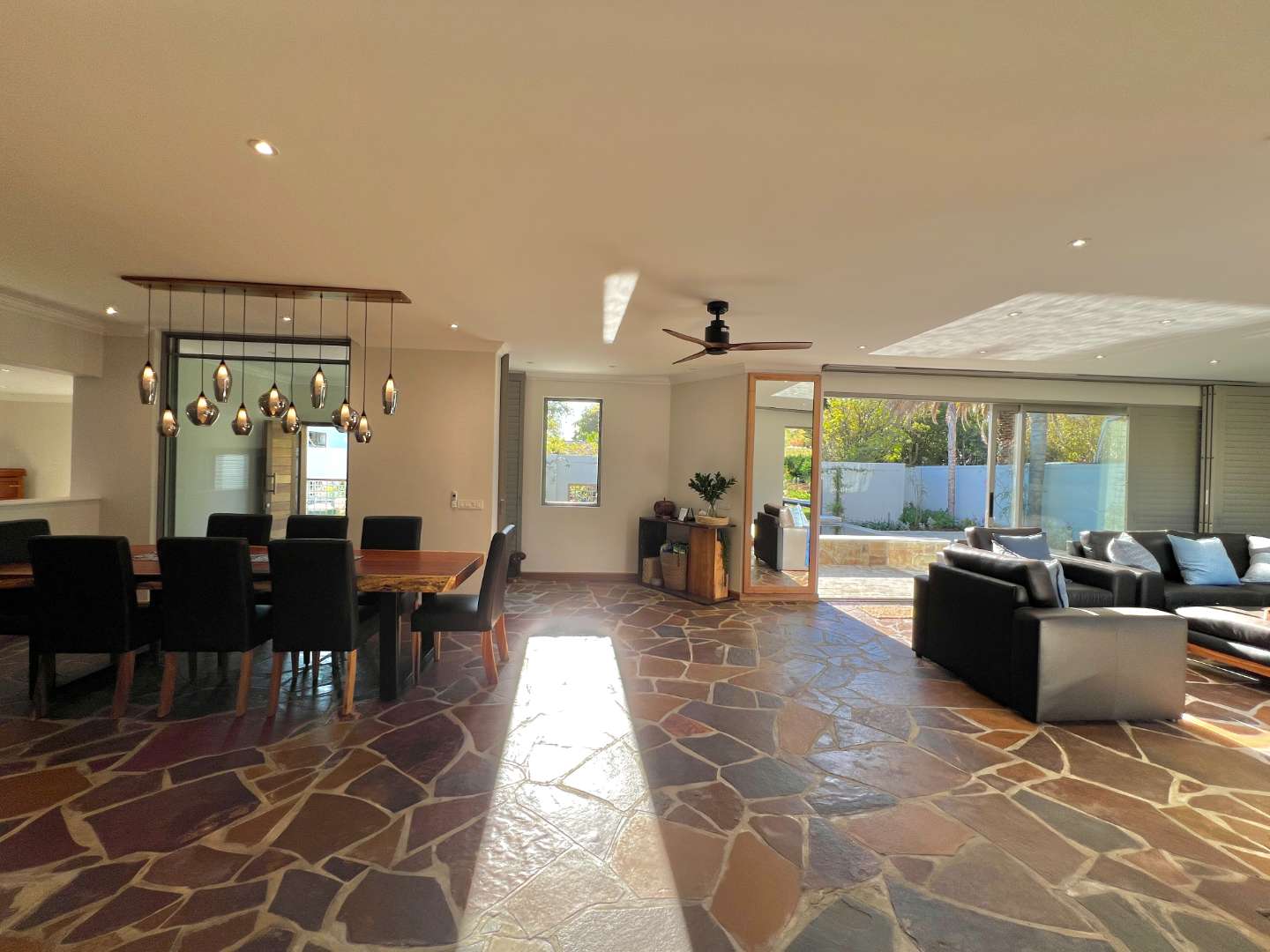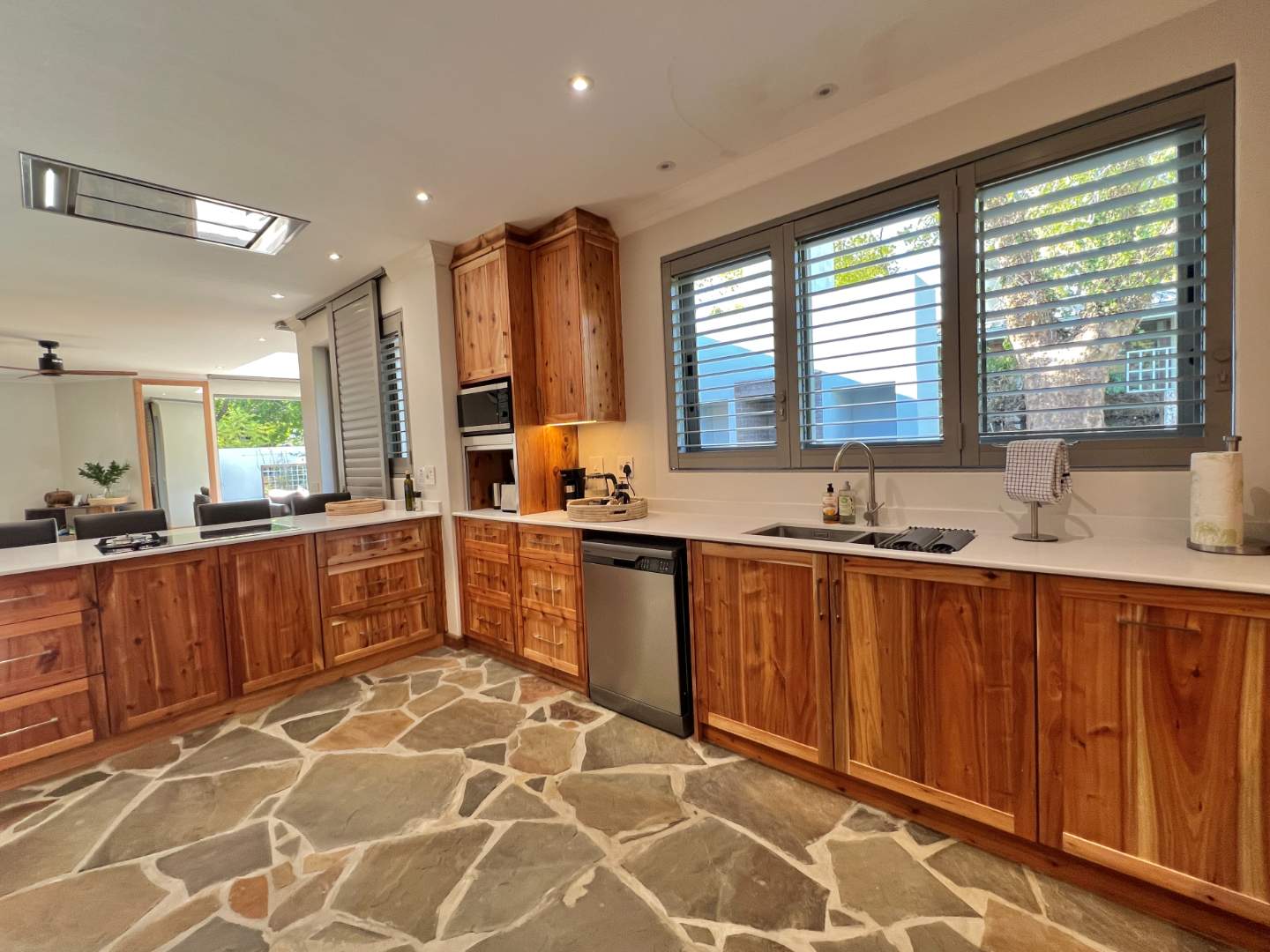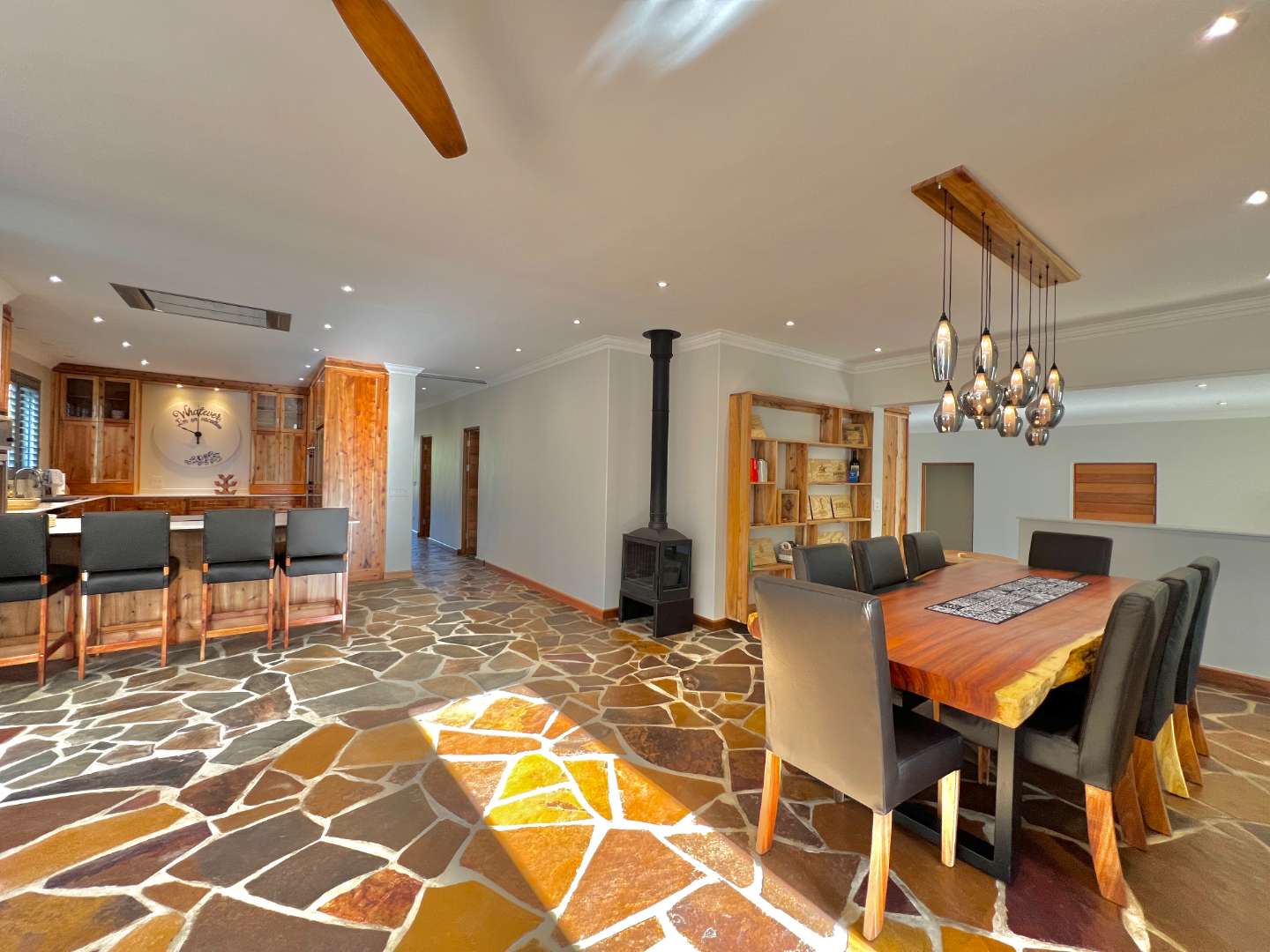 Enter into spacious living areas that flow into one another, from the rim flow pool to the lounge and dining area, to the barbecue area, where you can start drinking in the magnificent views of the Lanzerac vineyards, Botmaskop and Die Pieke mountains. The kitchen forms part of the living area and has large windows, also opening onto the barbecue area. A sunken bar area with table, ideal for board games and a television and smaller lounge, rounds off the entertainment picture.